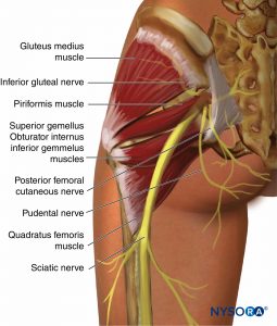 Piriformis syndrome is a condition in which the piriformis muscle, a small muscle located in the buttocks, irritates the sciatic nerve. This usually occurs as a result of muscular spasm or swellnig of the piriformis or irritation of the sacroiliac joint.