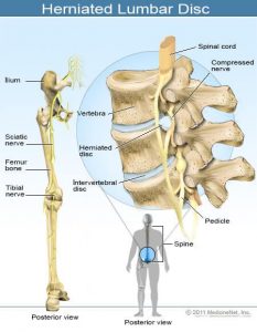 In certain circumstances the vertebral column is injured and can result in the vertebrae “shifting” out of position. In such circumstances, a protective “cushion” located between the vertebrae (known as the intervertebral disc) may rupture and press on the nerve root. When this occurs, there is severe irritation and compression of the nerve root leading to severe pain which sends further pain signals throughout the nerve resulting in symptoms of sciatica. Cases like this often need surgery to correct the injured disc.